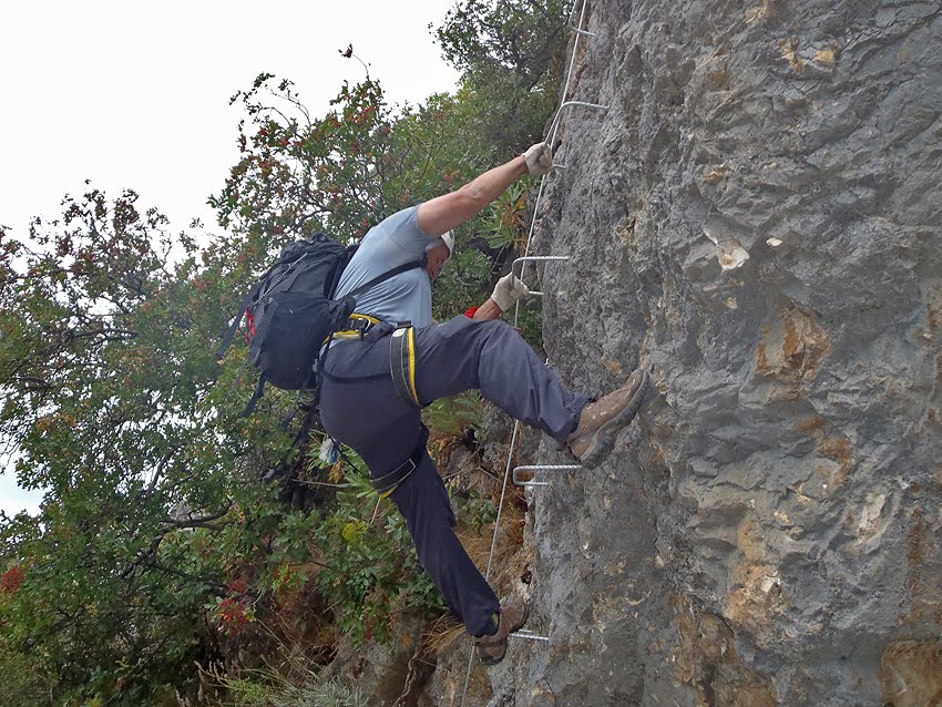 Es una ferrata de escasa dificultad técnica, pero muy atlética, pues su desarrollo en horizontal, con bajadas y subidas la hace exigente a los brazos. Cuando aún no estabamos ni en la mitad del recorrido, se desató una fuerte tromba de agua con truenos, por lo que decidimos gatear hasta la cornisa de arriba y volver al coche. Tanto la roca, como las propias grapas resbalan cantidad con la lluvia. Volveremos pronto para finalizarla.